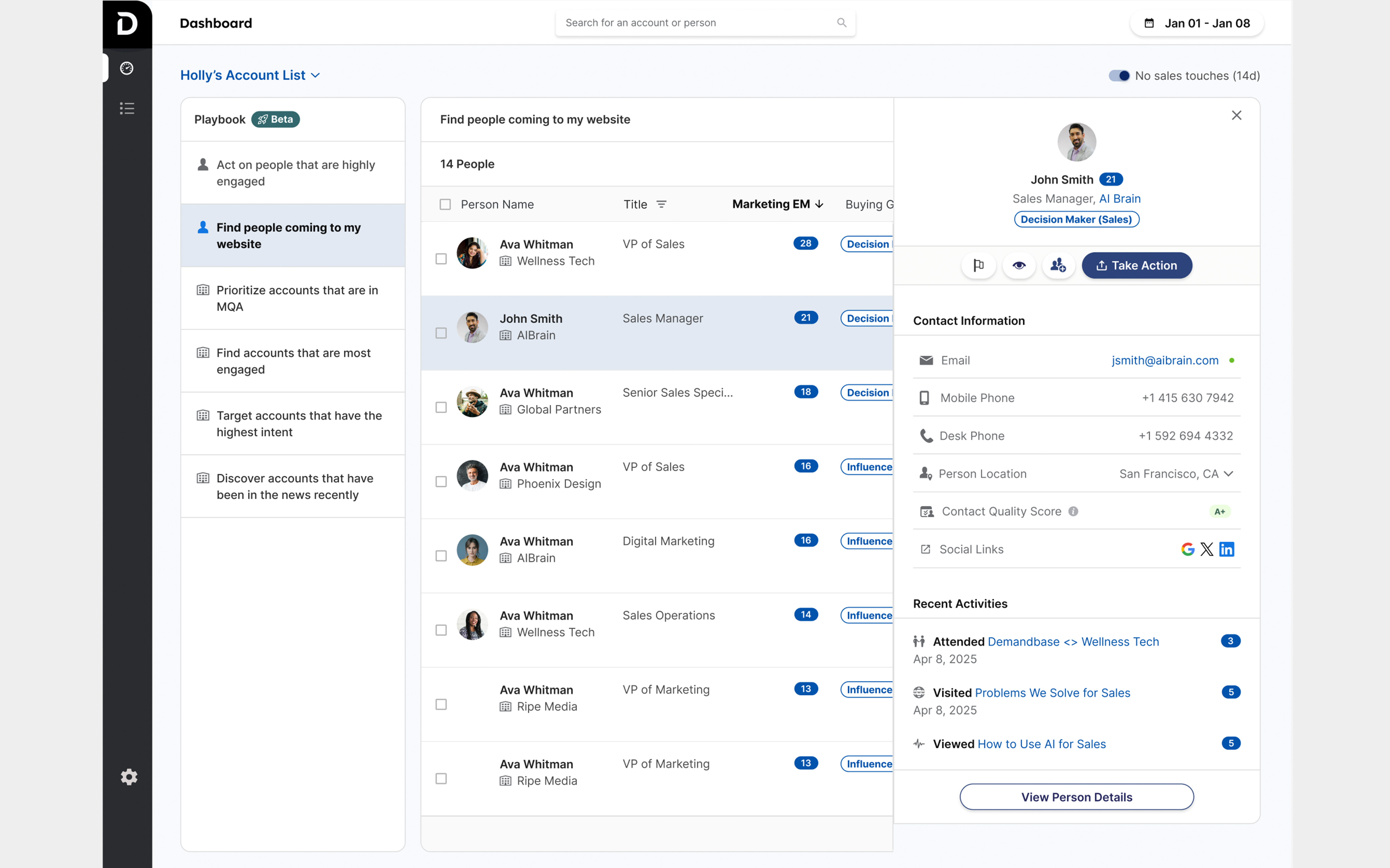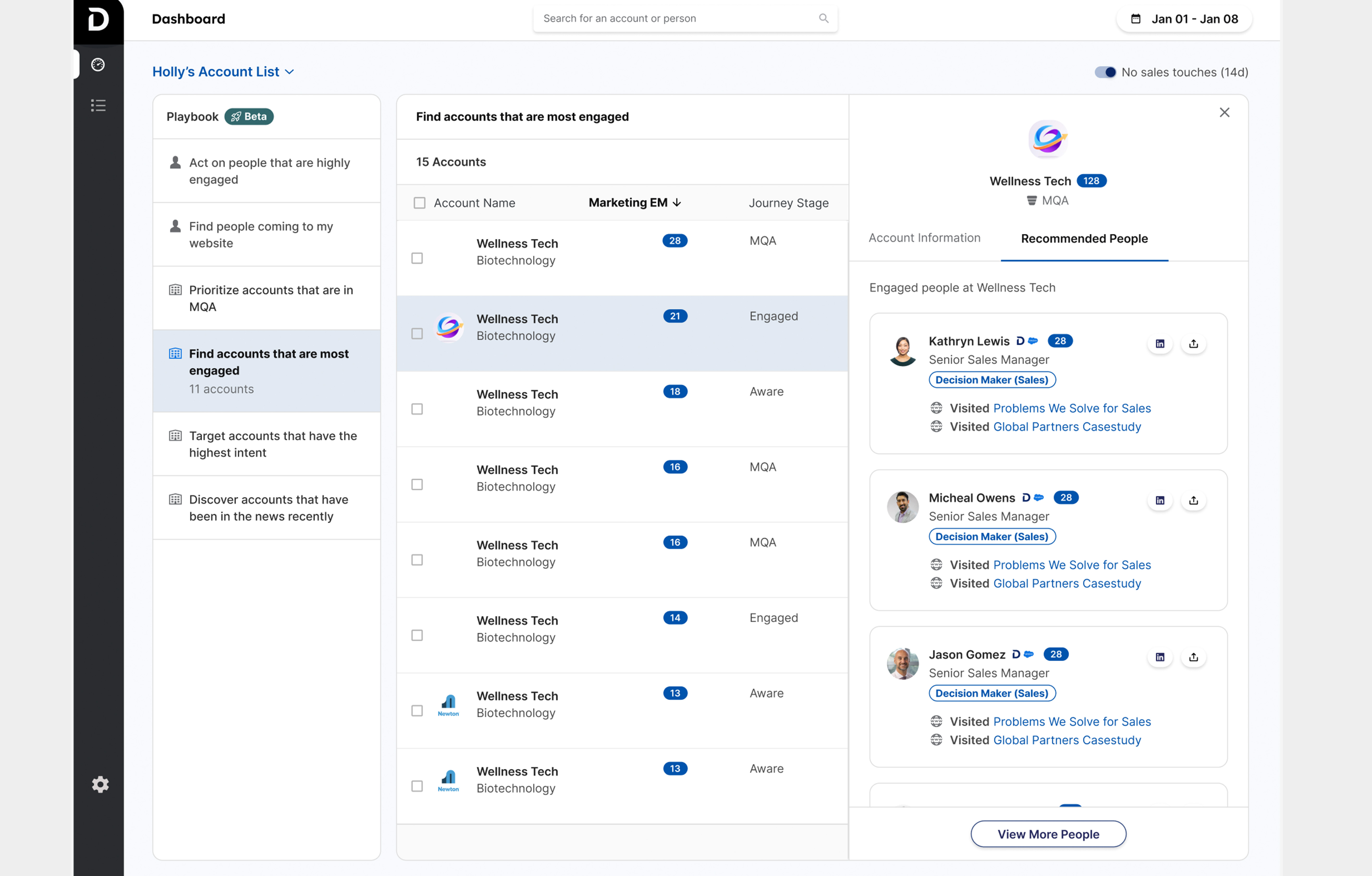 • Integrated intent and engagement signals to dynamically surface high-value contacts and accounts, ensuring reps focus on the most impactful opportunities.